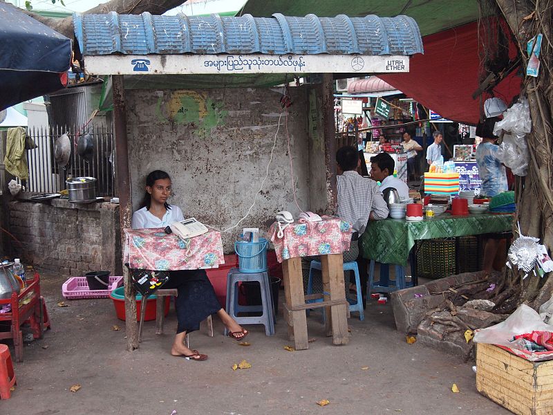 En bod i Myanmar i 2013, hvor folk kunne købe sig til samtaler på fastnettelefoner. I dag har store dele af befolkningen mobiltelefoner (foto: Andreas Hansen).