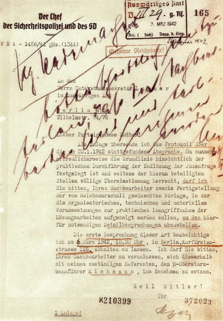 Et følgebrev sendt til Luther (ledende nazi-officer) sammen med en af de i alt 30 protokoller fra Wannsee-konferencen.
