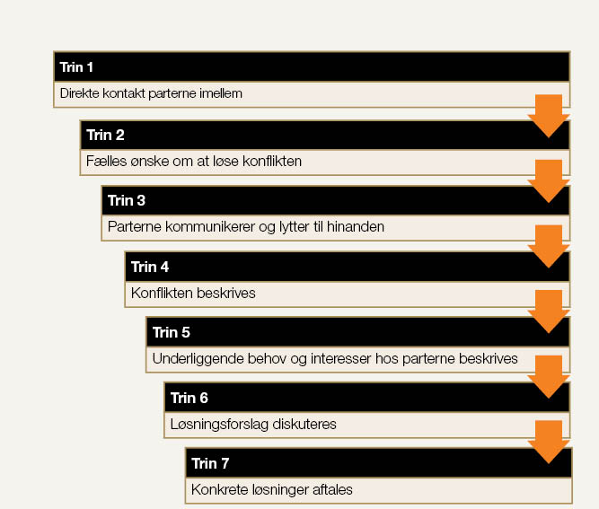 Denne model kan du anvende, når du skal analysere en konflikt for at finde ud af, om den er på vej til at blive løst. Du kan også finde ud af, hvor tæt på en løsning en igangværende konflikt er og hvilket trin, der er det næste i processen.